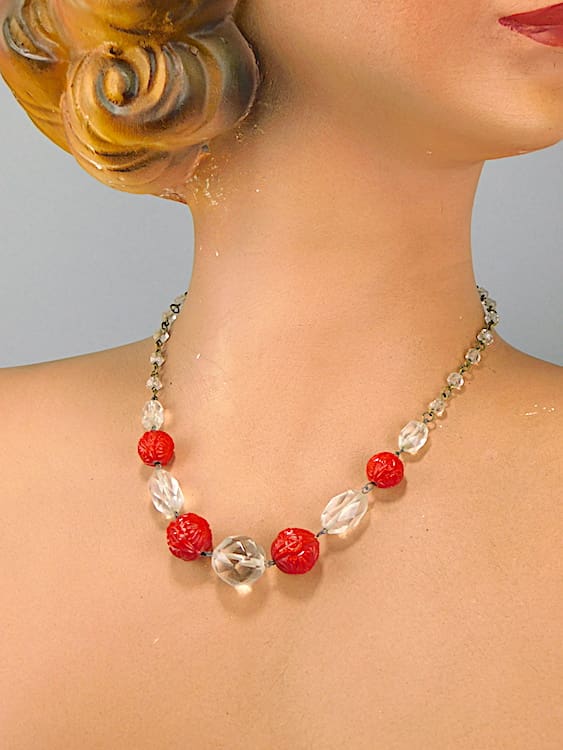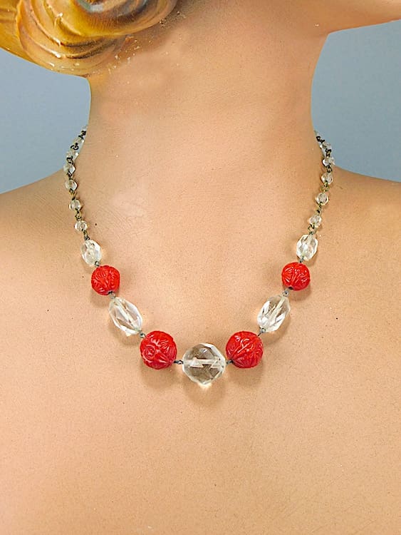 1920’s carved red glass and faceted clear glass beads on a metal chain.