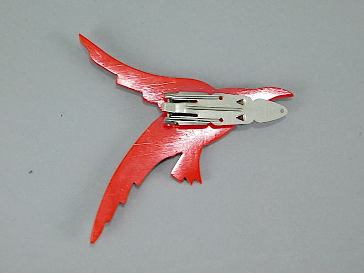 This red galalith flying bird is a dress clip, but can be worn as a brooch.