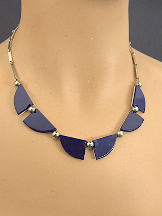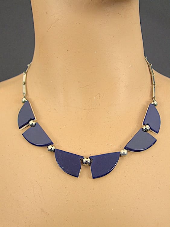 Navy blue and white galalith necklace, can be reverse worn as white or this side as navy. Made in the early 1930’s by Jakob Bengel foundry and fitted with a screw clasp.