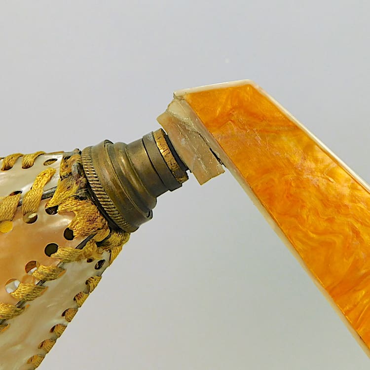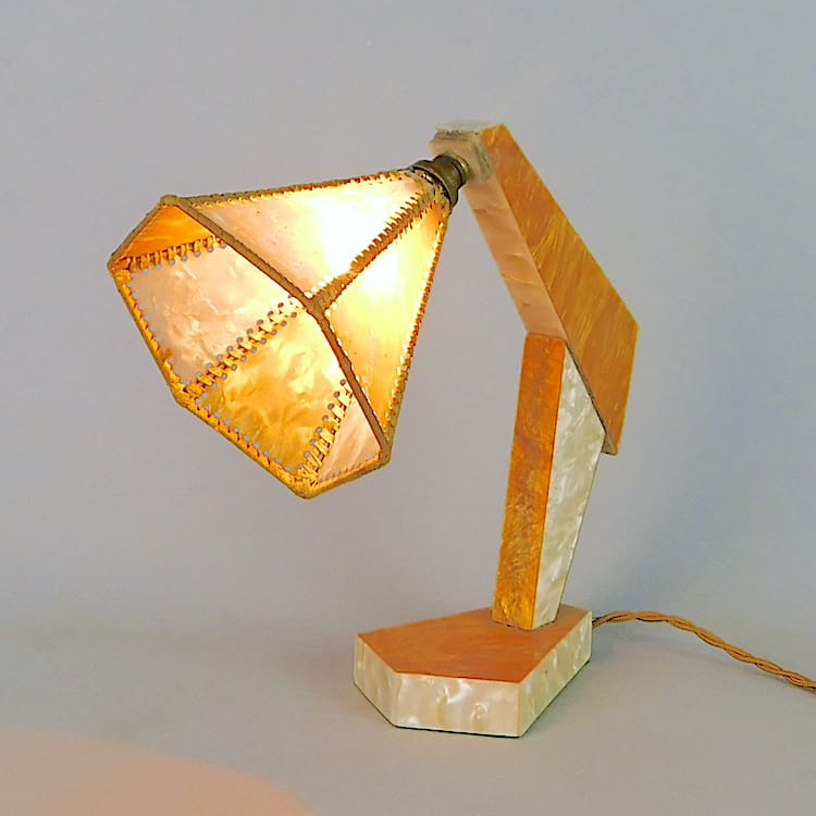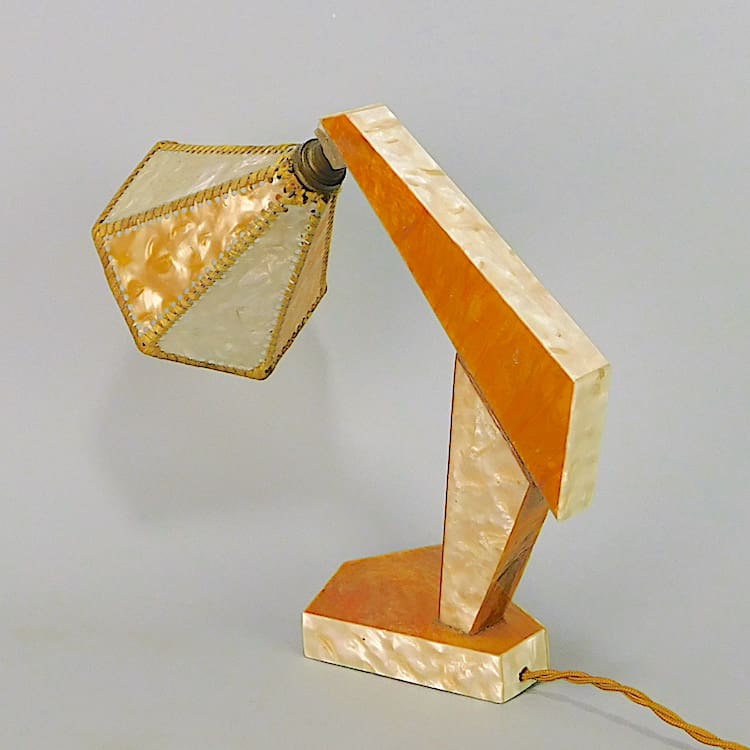 French table lamp with original shade and base in rare rhodoid phenolic material.