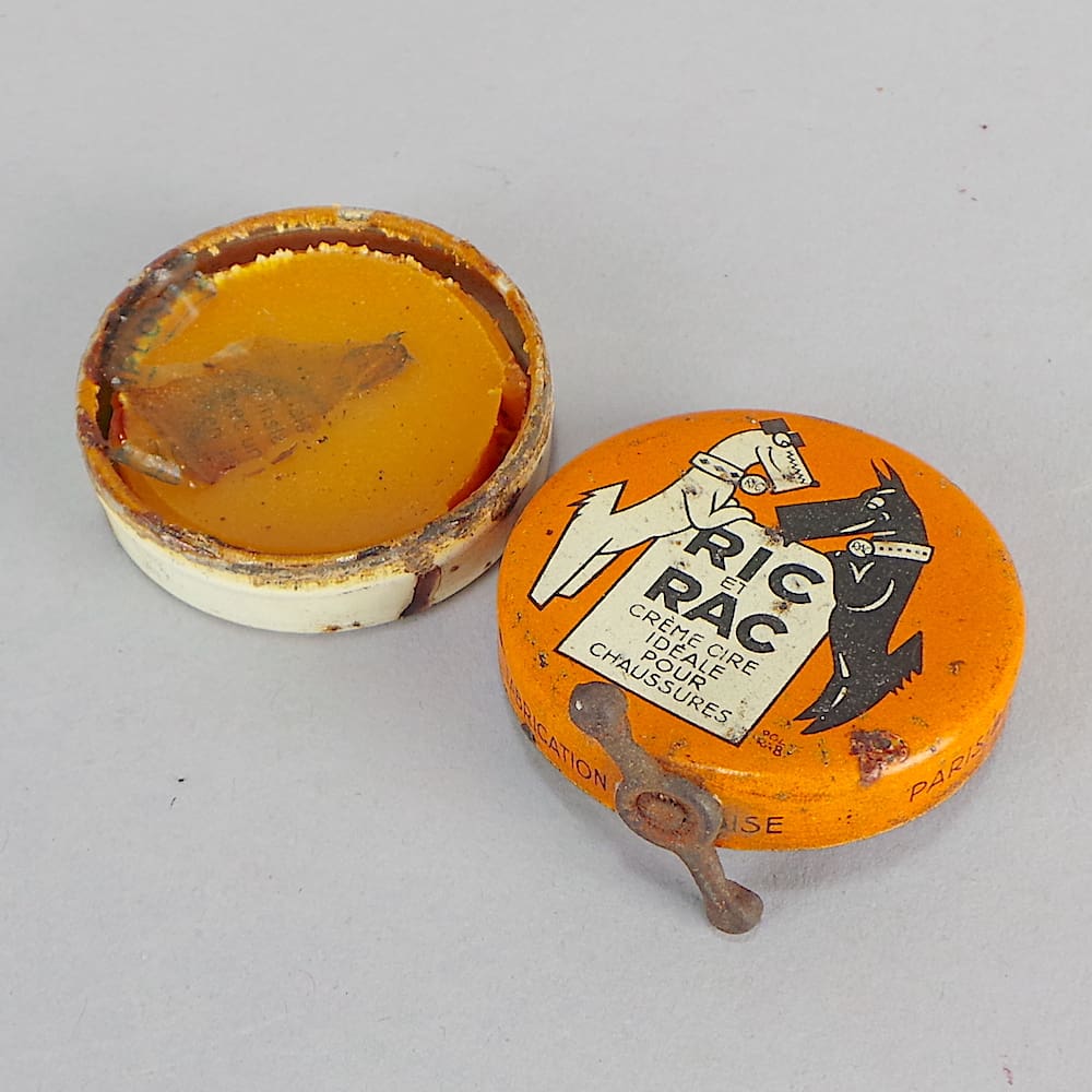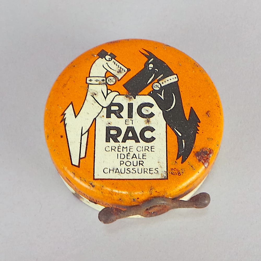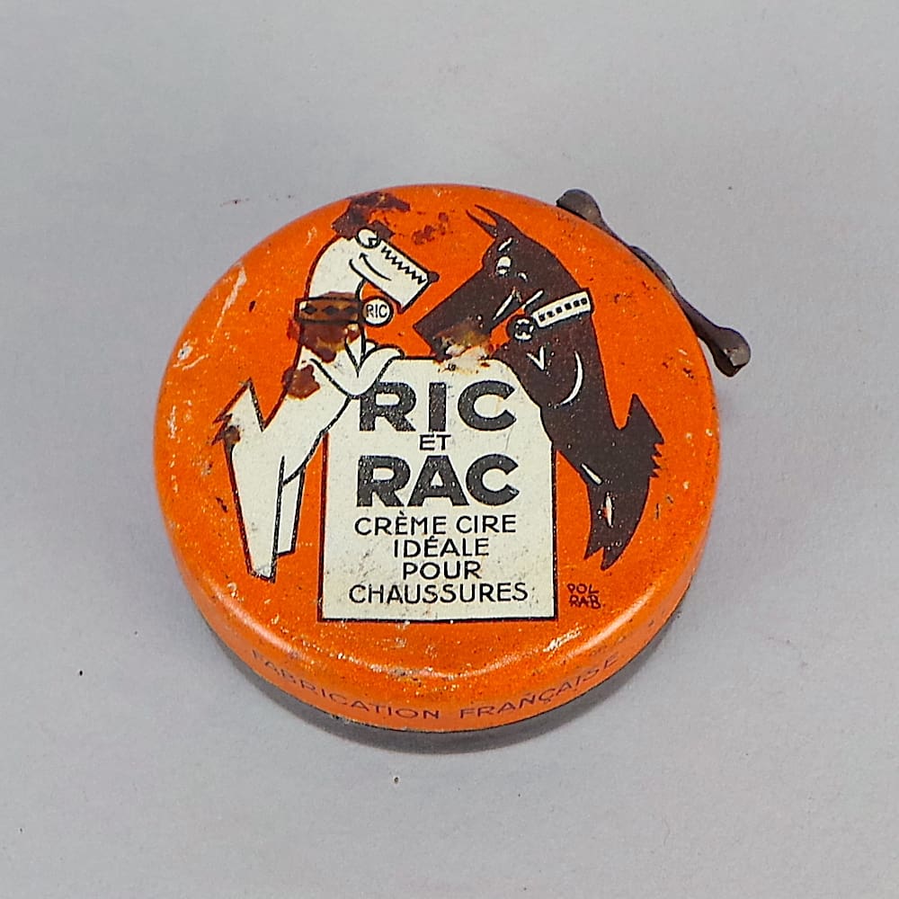 The lid reads “Ric et Rac Creme Cire ideale pour chaussures” and also carries the signature of Pol Rab, the creator of the Ric and Rac characters.