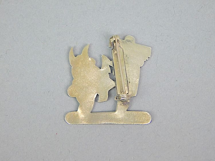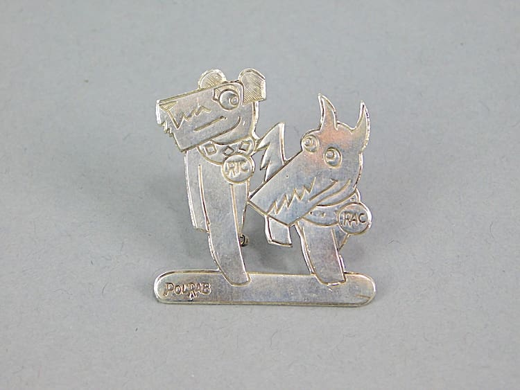 French art deco silvered metal Ric and Rac the terriers, signed Pol Rab to the bottom left. Fitted with roll safety clasp.
