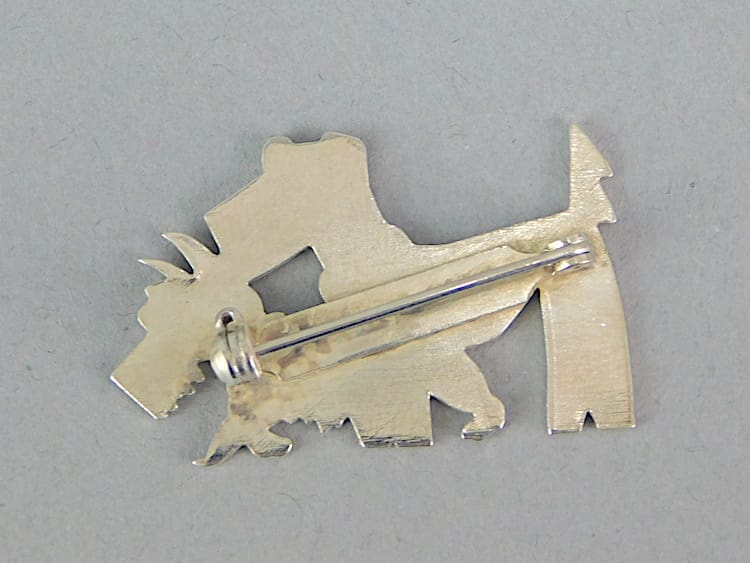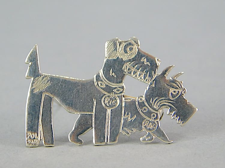 Art deco Ric and Rac the naughty terriers designed by and signed Pol Rab. Fitted with a roll safety clasp.