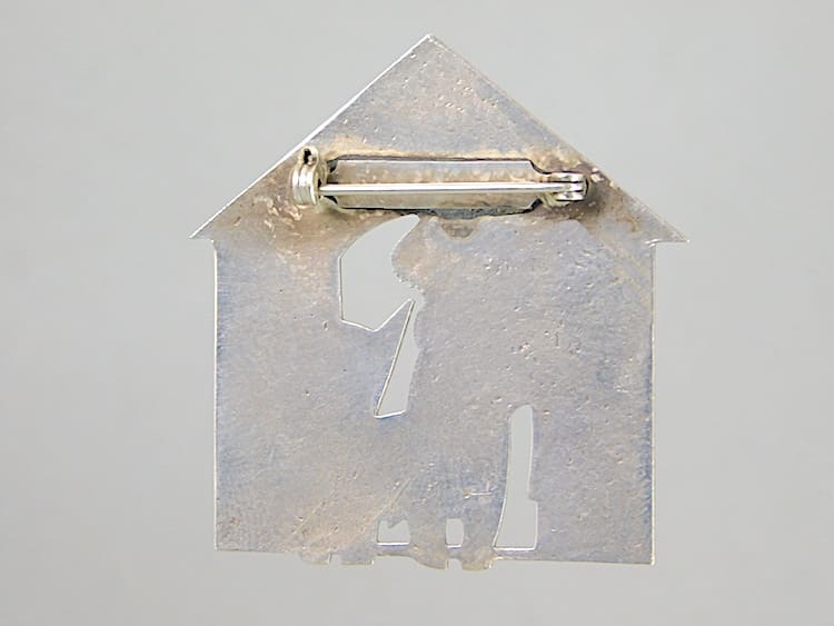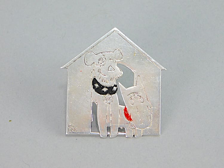 French silvered metal art deco brooch depicting Ric and Rac the naughty terriers in their kennel. Signed by Pol Rab and fitted with a roll safety clasp.