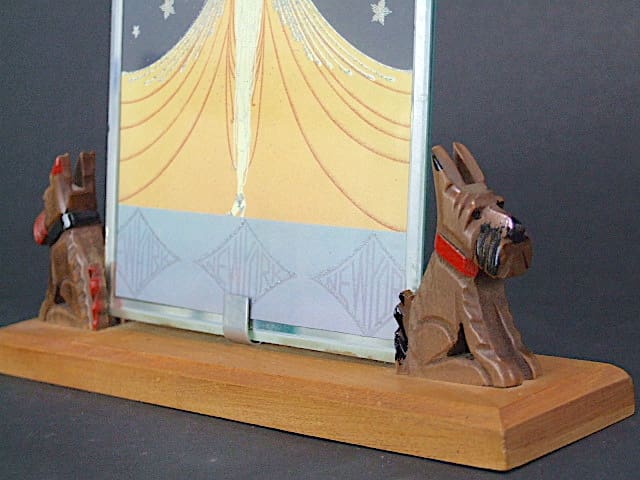Carved wood and painted Ric and Ric dogs from the cartoon series by Pol Rab, on a shaped wood base and with its original mirrored glass frame.