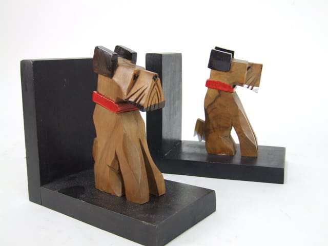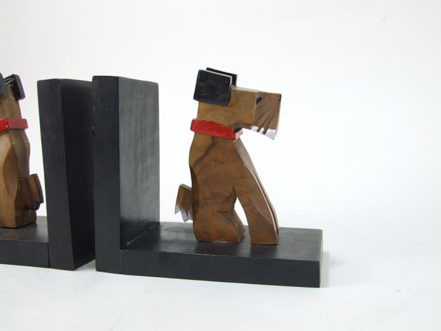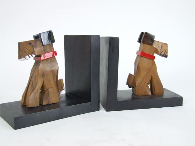 French Art Deco hand carved Ric and Ric wooden bookends by Pol Rab. Showing the naughty terriers in cubist form with enamelled detailing.