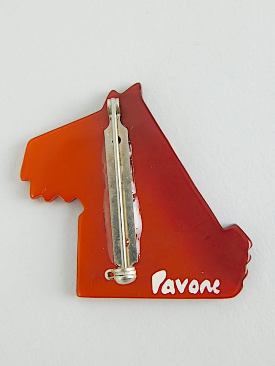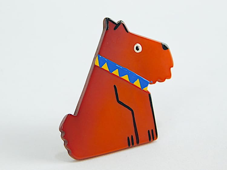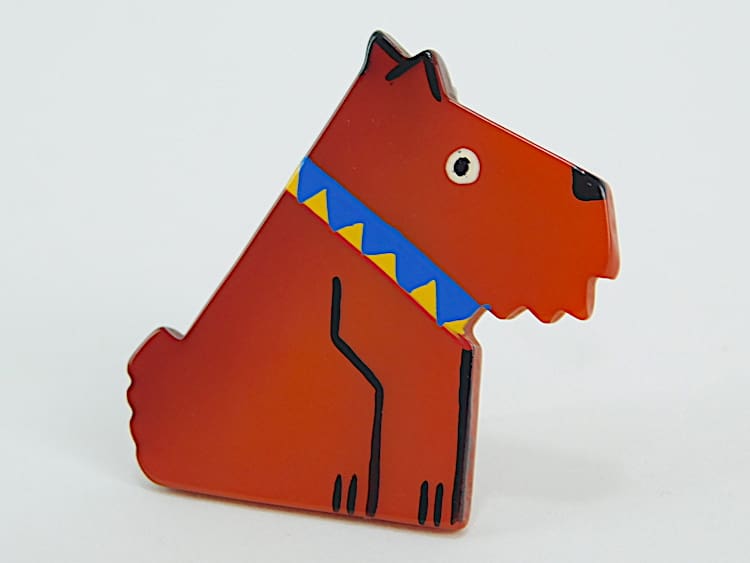 French hand painted and signed galalith Ric the terrier brooch by Marie-Christine Pavone.