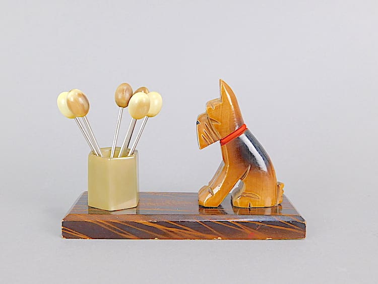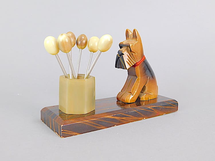 French art deco cocktail sticks set – modelled as Ric the naughty terrier by Pol Rab. Phenolic cup and six cocktail sticks. Mounted on a rosewood base.