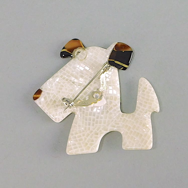 Not many of these Ricquet dogs were made. This is an early version of Lea’s classic Ric dog brooch. It is more in the style of the famous French cartoon dogs Ric and Rac by Pol Rab.