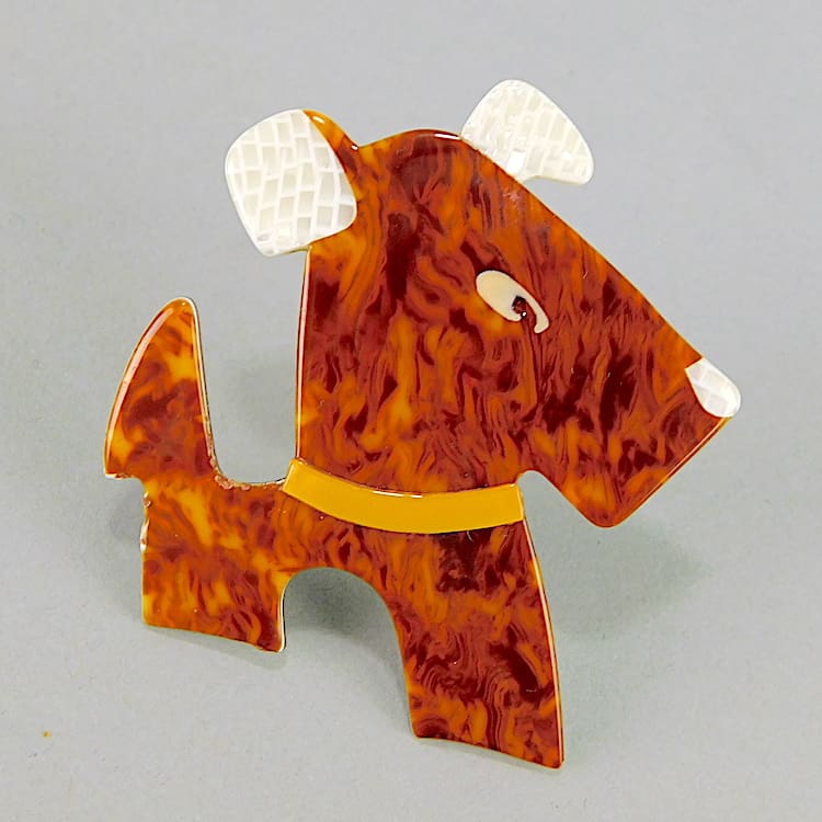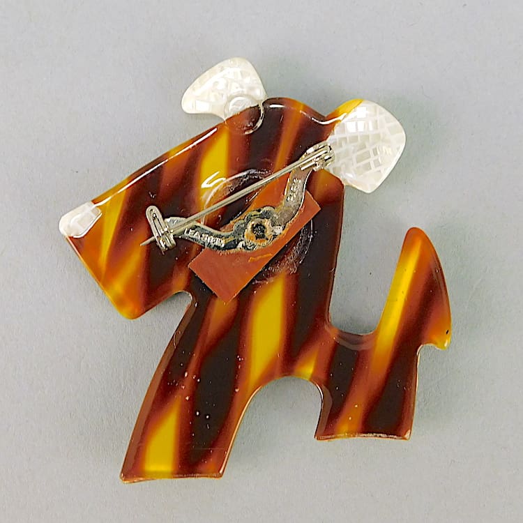 Not many of these Ricquet dogs were made. This is an early version of Lea’s classic Ric dog brooch. It is more in the style of the famous French cartoon dogs Ric and Rac by Pol Rab.