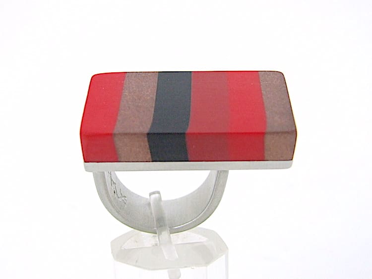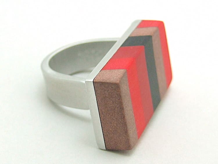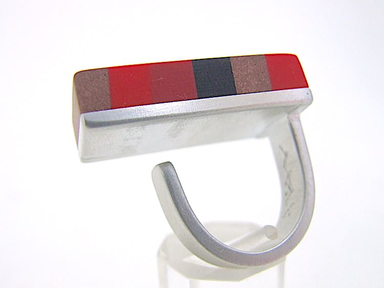 Art Deco style aluminium and phenolic resin huge ring. This ring is asymmetrical and spans two fingers. A signed vintage Debraine and no longer in production. It will adjust to fit any size of finger as its open to the back.