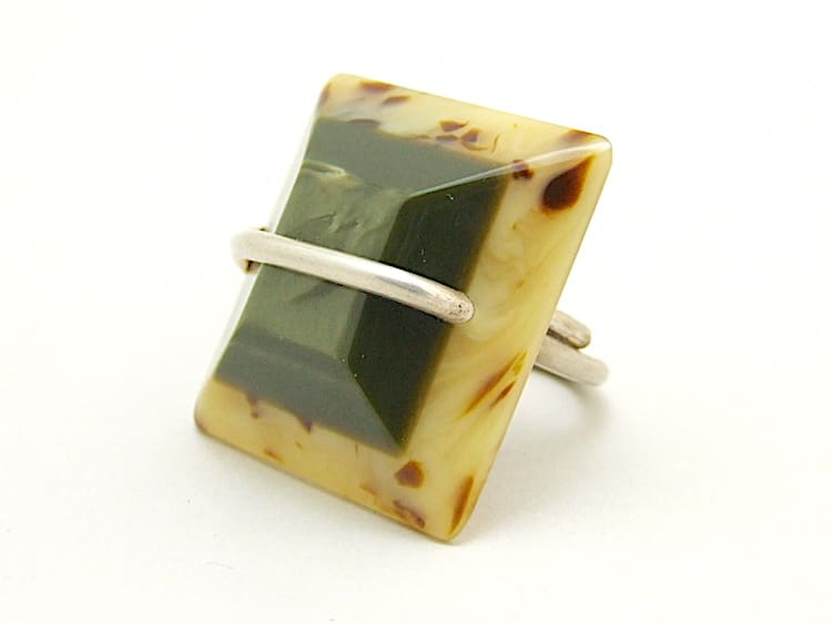 Huge art deco style galalith and silver ring. A signed vintage Debraine and no longer in production. It will adjust to fit any size of finger as its open to the back.