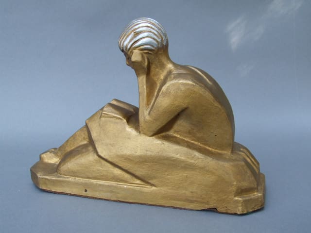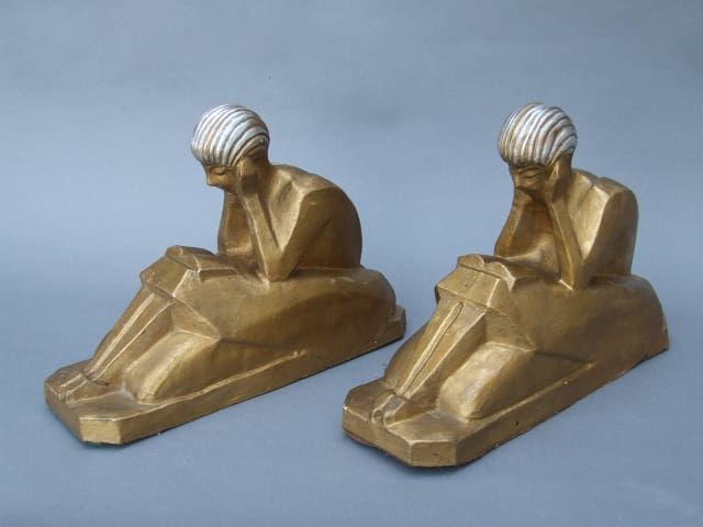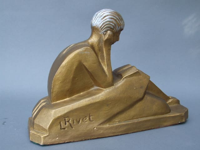 French white terracotta cubist lady reading a book, bookends. Signed L. Rivet to the base. Each has a gold patina and silver highlighting to the hair.