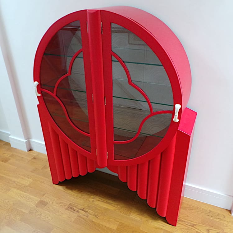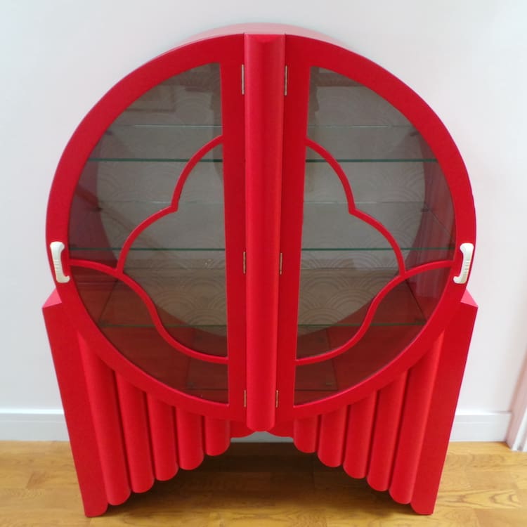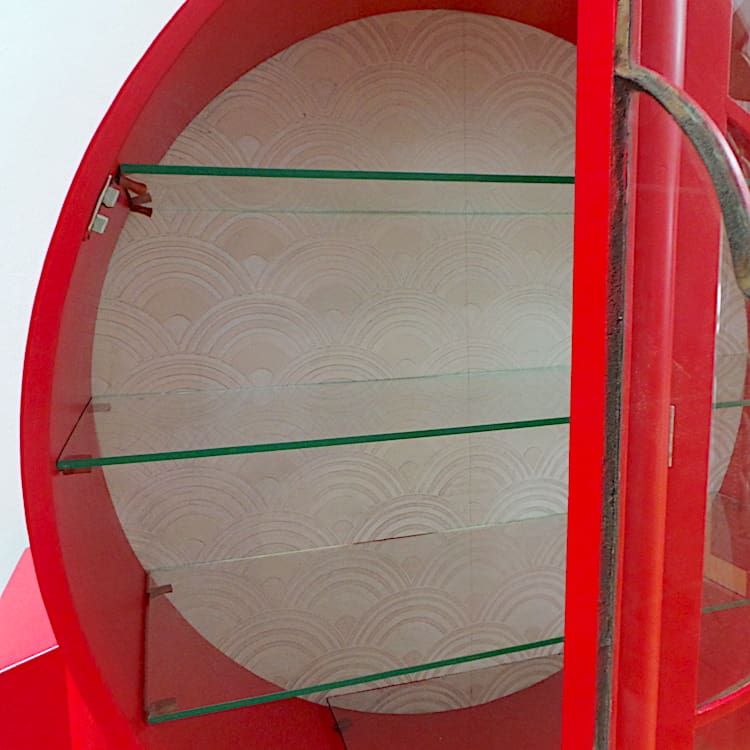 English art deco ‘rocket’ display cabinet in a light red satin finish.