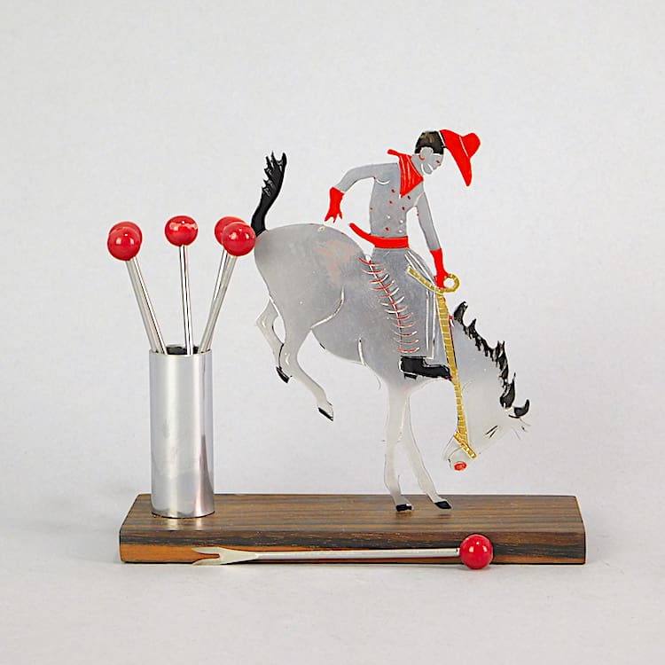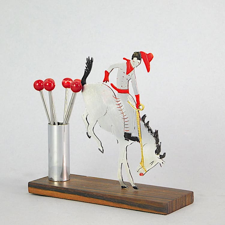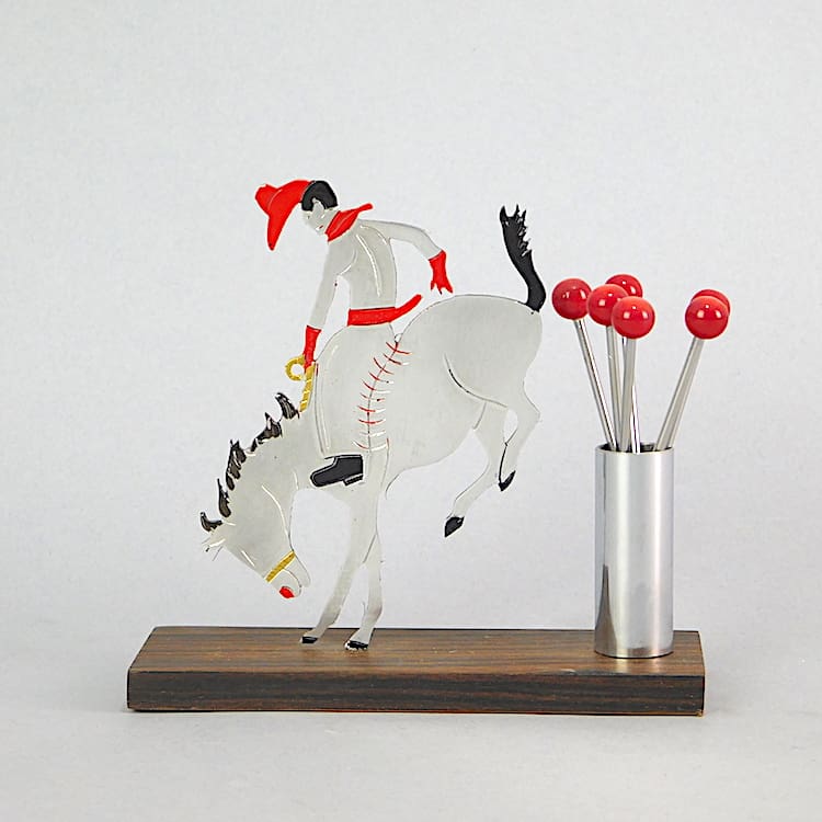 French cocktail sticks set with a rodeo theme by Sudre. Base is made of macassar ebony.