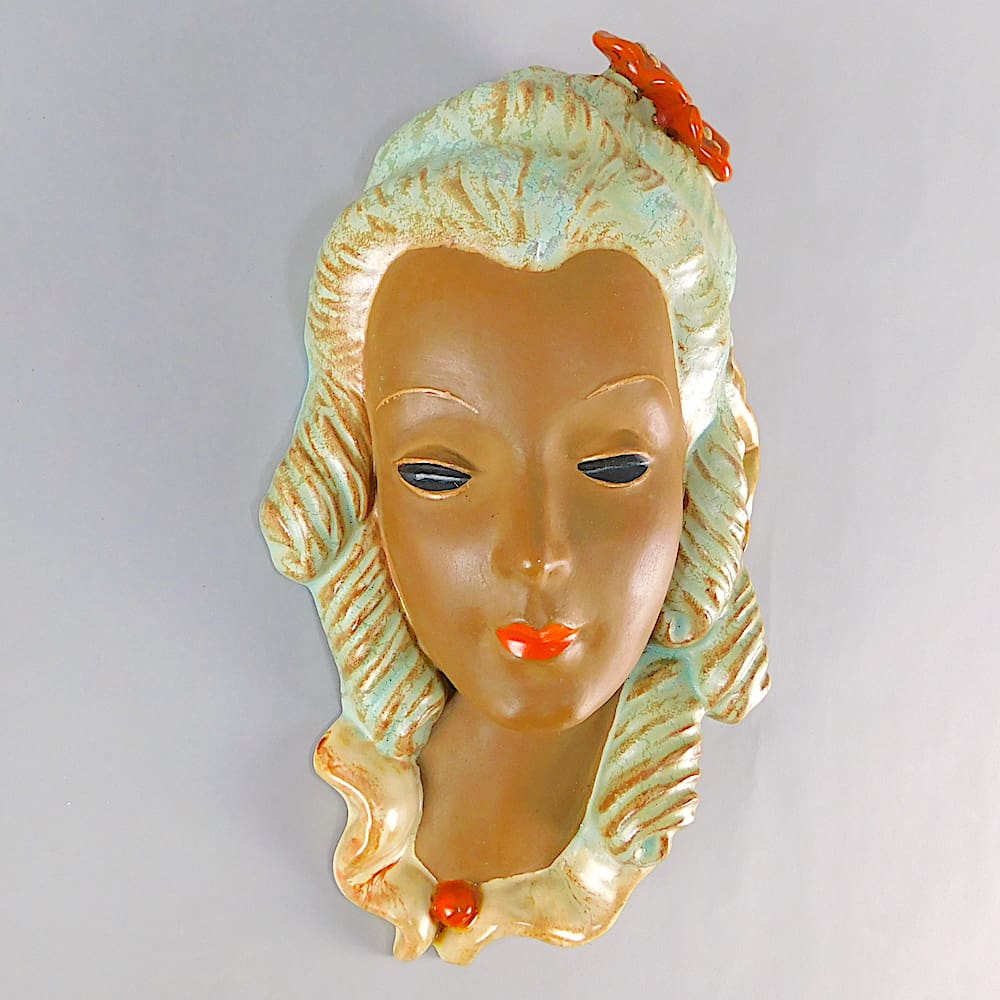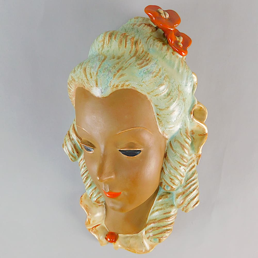 Pretty hand painted art deco wall mask made in 1940 by Goldscheider.