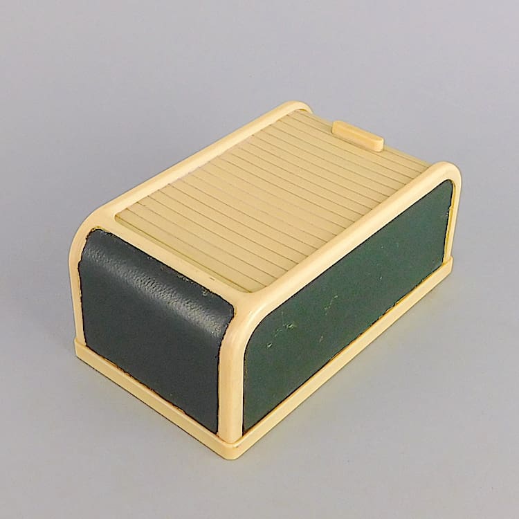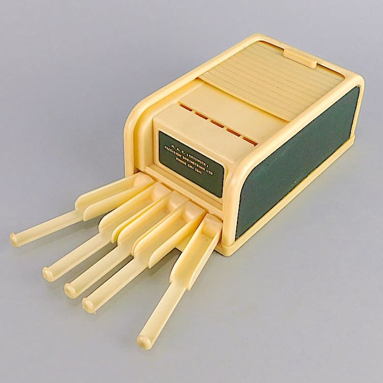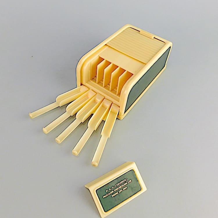 The top is amazing – Magic, even! You roll the lid back and remove the front panel, inside are 5 slots to hold a number of cigarettes in each, fill them up and close the lid, now every time you roll the lid back 5 arms pop out which hold cigarettes.