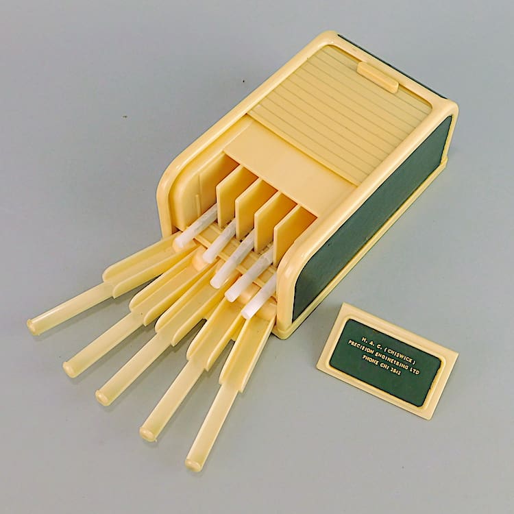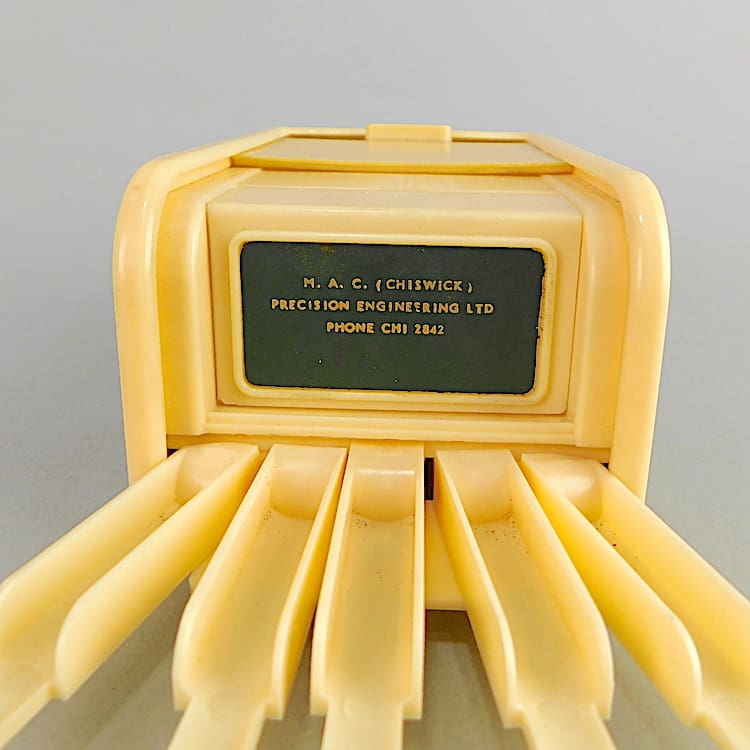 Inside there is another green leather panel to the front that reads M.A.C. (Chiswick) Precision Engineering ltd and Phone CH1 2842.