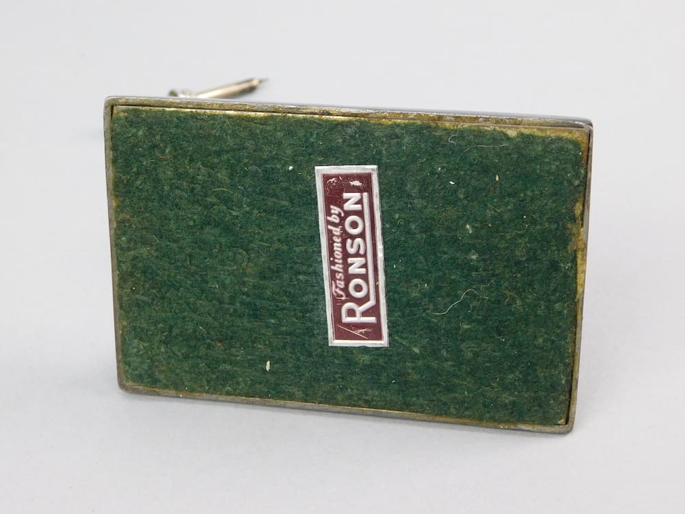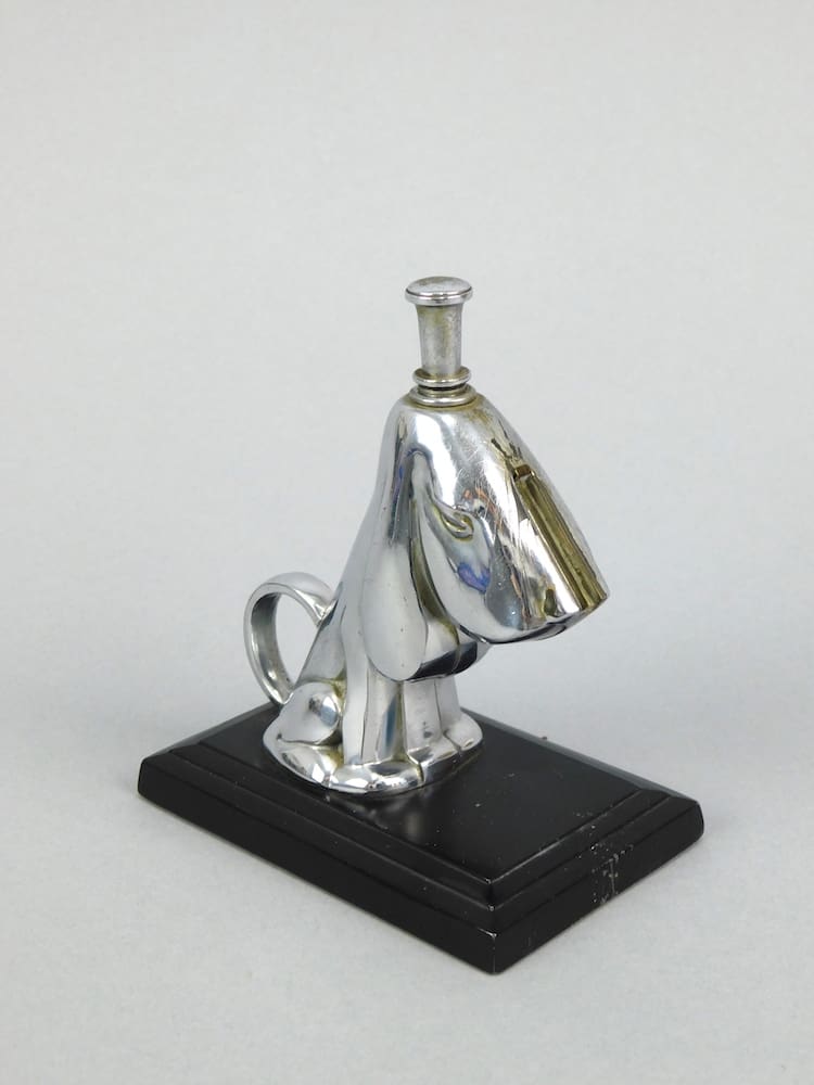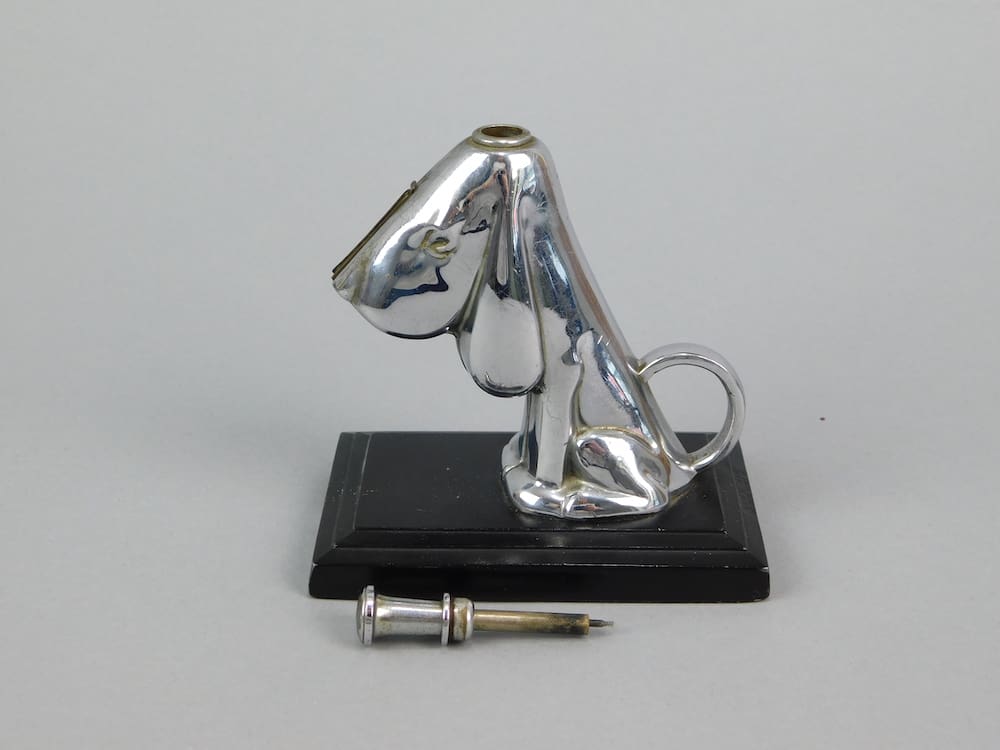 American dog striker lighter by Ronson. It bears the Ronson label under the base and is marked Art Metal works 1935 to the black metal base. Comes with its original striker wand.
