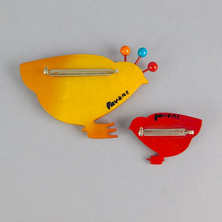 Rare French galalith hand made and signed brooch set (2). Signed to the reverse Pavone and each fitted with roll safety clasps.