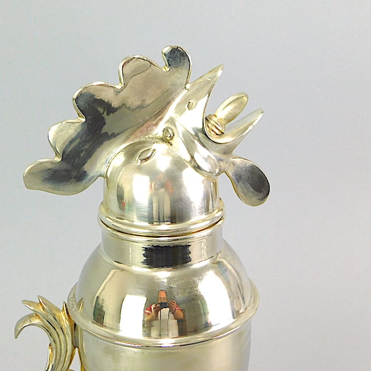 Silver plated rooster cocktail shaker made in the 1970s as a copy of the Wallace Brothers 1928 one. Marked Restoration Hardware to the base. It splits into 3 parts – base head and tongue stopper.