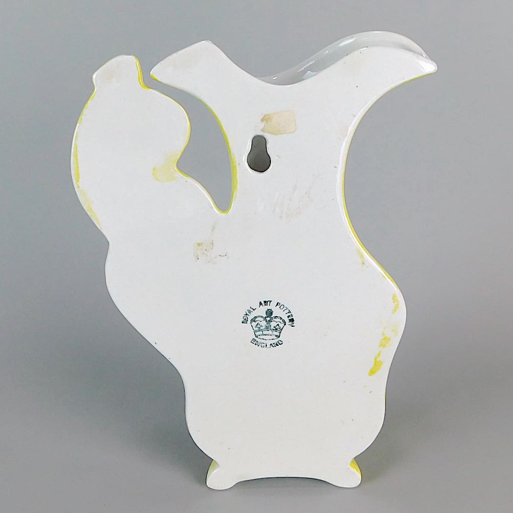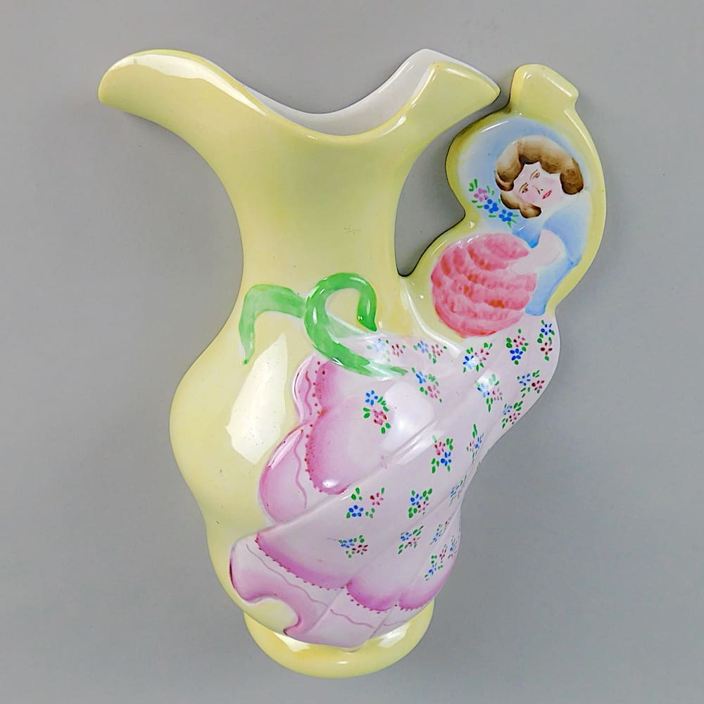 A crinolyn lady, hand painted onto a jug shaped wall pocket.