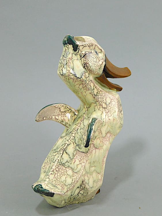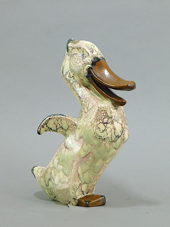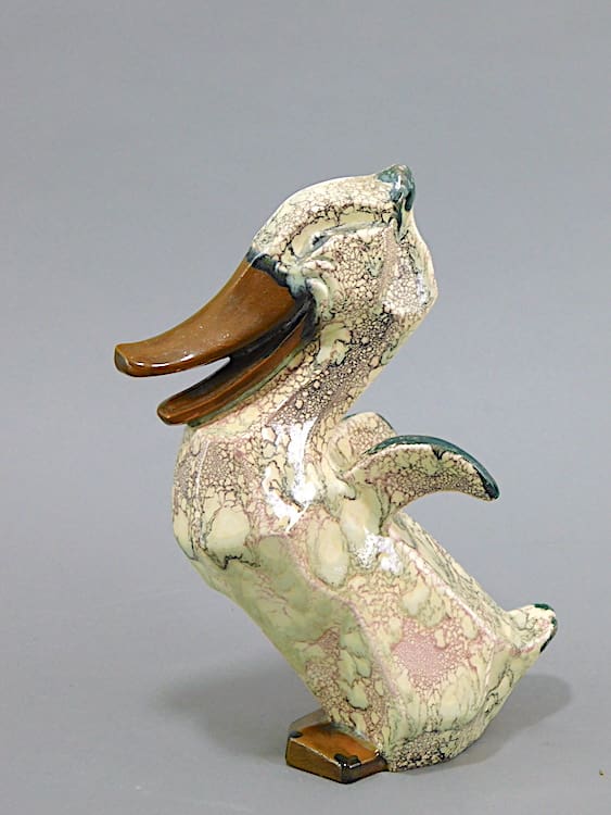 This duck is unmarked but is by Royal Dux and therefore a Czechoslovakian piece and has an amazing sponged oxidised glaze in green, brown and pink.