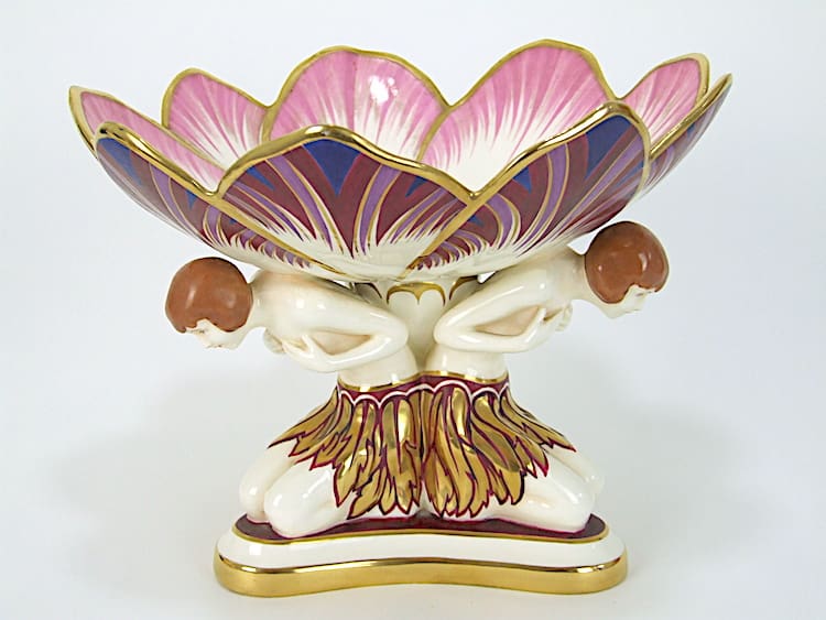 A large flower tazza dish supported by a trio of semi nude girls. This very rare piece is marked Dupoma and Czech under the bases. Made by Royal Dux for Dupoma. These hand painted tazzas and candle stick holders bear Czech and Dupoma marks to the base.