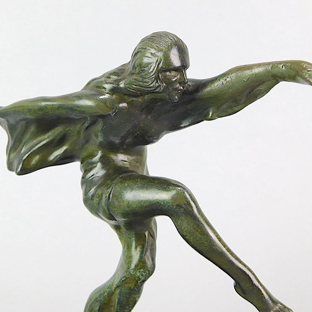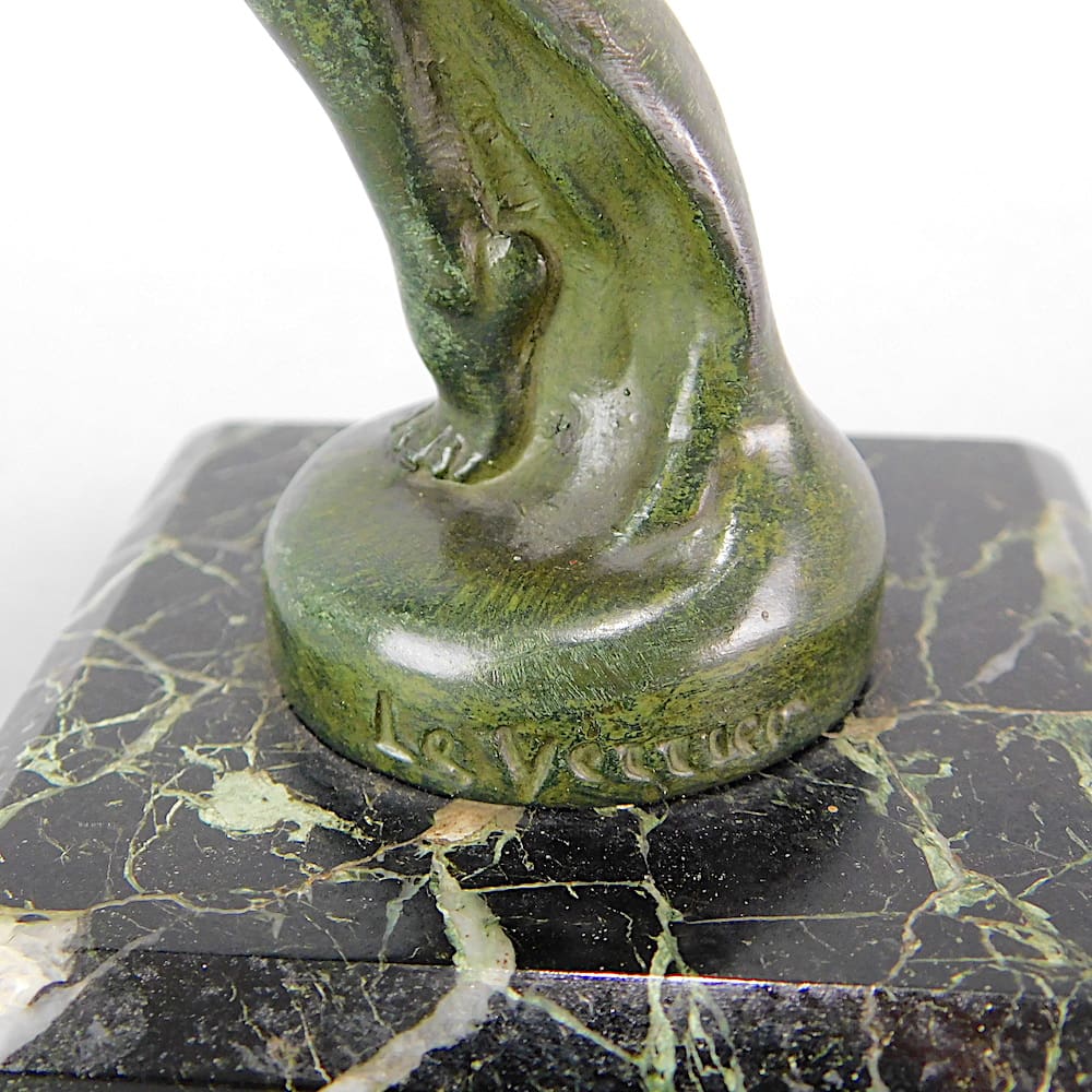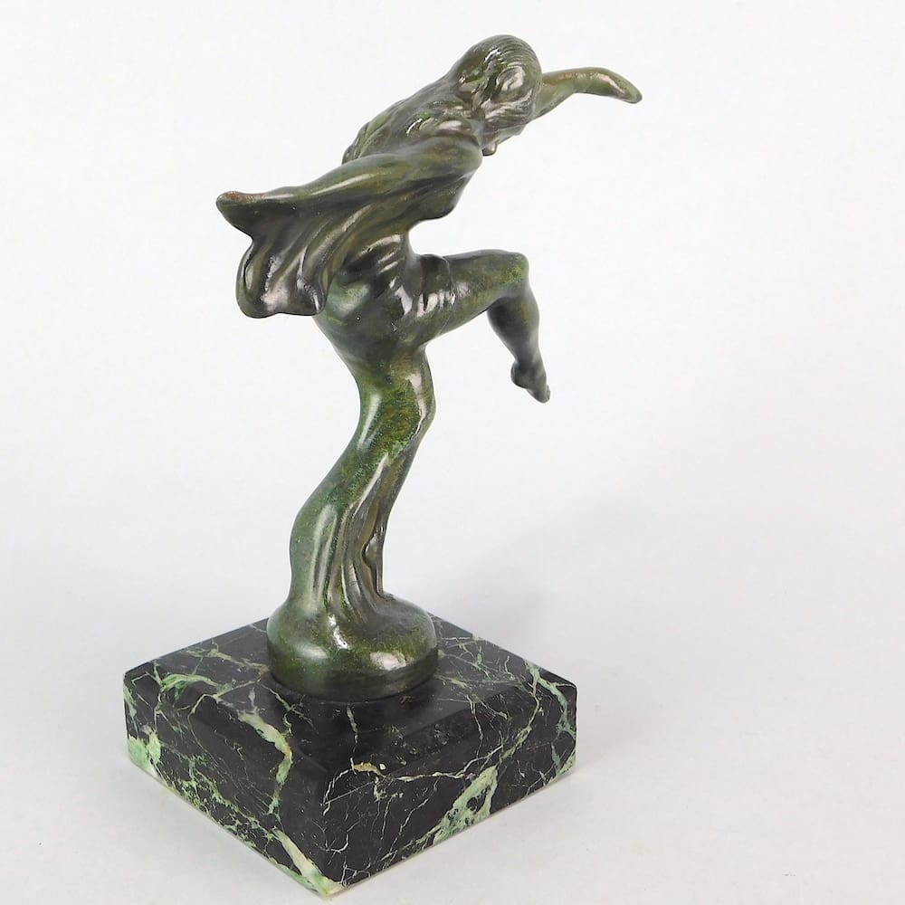 A small green patinated spelter figure called Sadi, and mounted on a verdigris marble base. Signed in the metal and designed as a car mascot in the 1930’s.