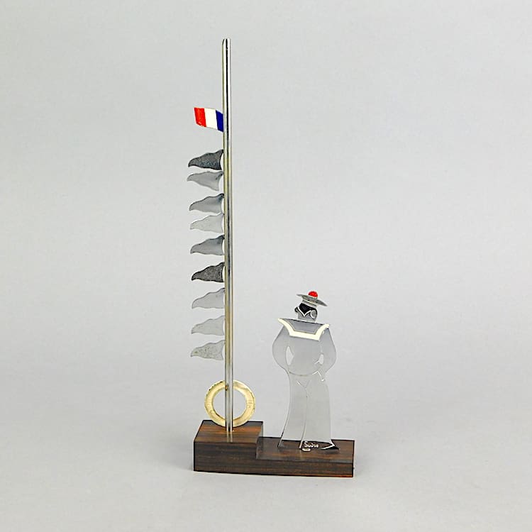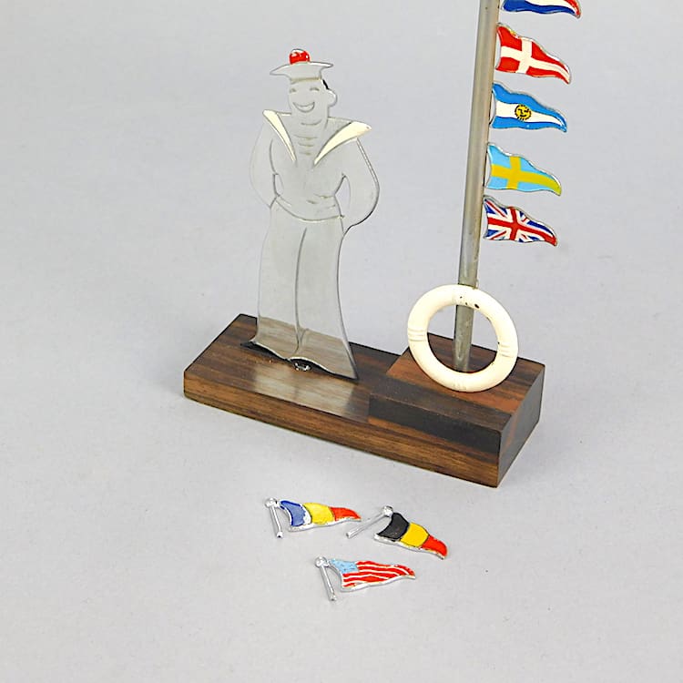 Signed Sudre sailor with flags for glass markers. The base is made of macassar ebony and you slide the flags up off of the pole to slot them on the side of your cocktail glass. The sailor is signed Sudre to his back trouser leg. The French flag is not original to the piece.