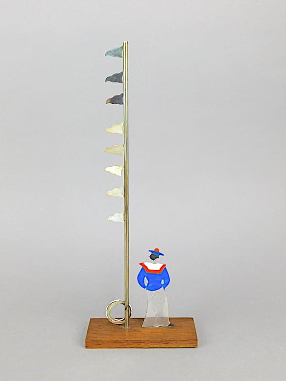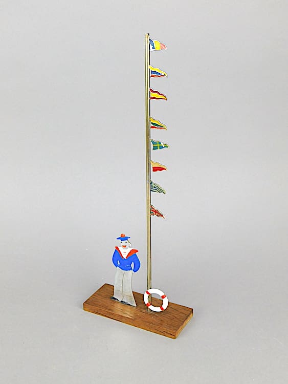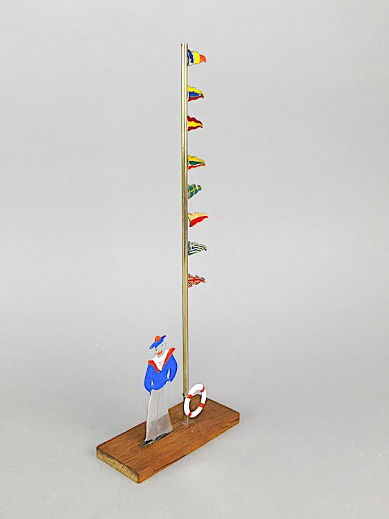 A French Art Deco Sailor next to a flag pole. The flags are the glass markers and the sailor is signed to the back of his trouser leg. There are 8 lag glass markers.