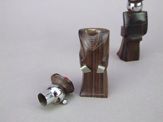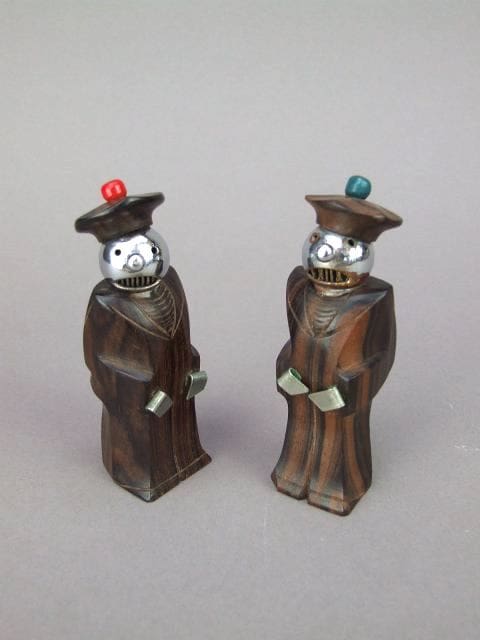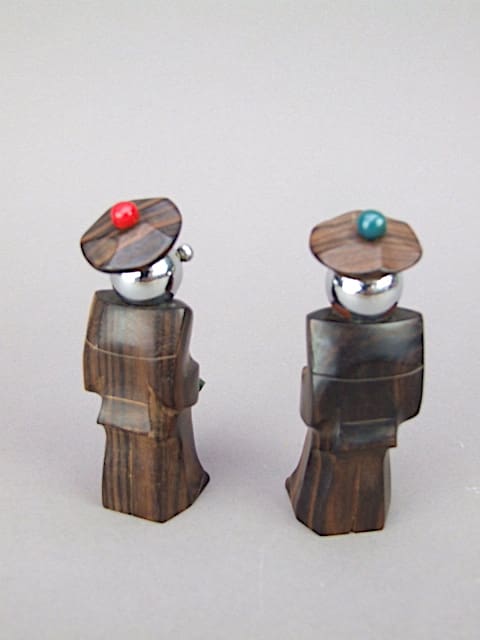 A pair of macassar and chrome sailors – very modern in design and either French or possibly Austrian. Their heads come off to put salt and pepper into the body and the contents shake out on their mouths.