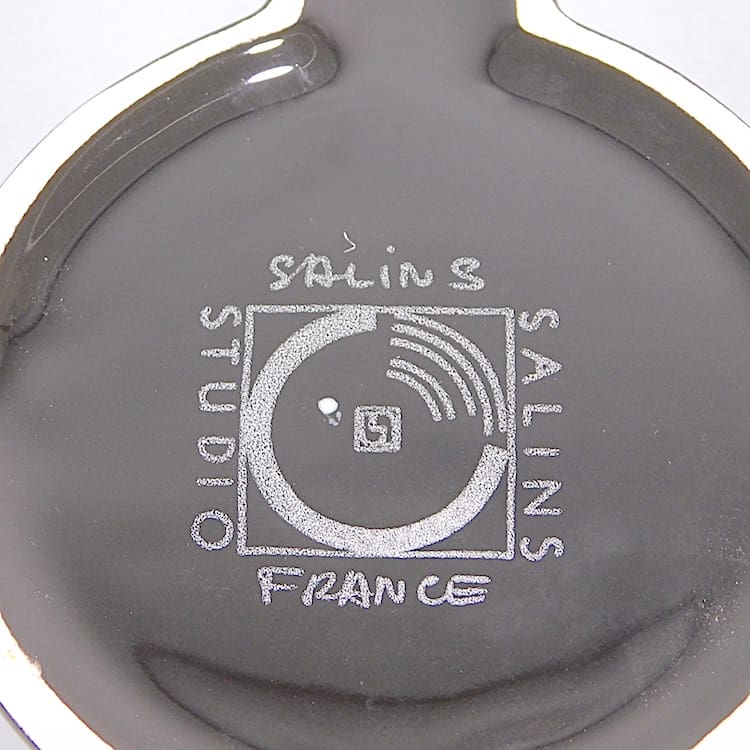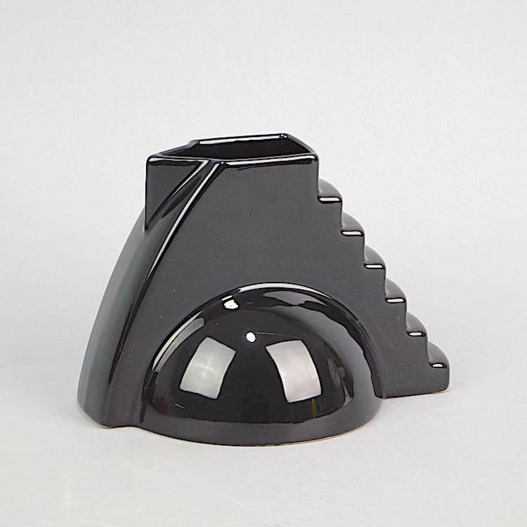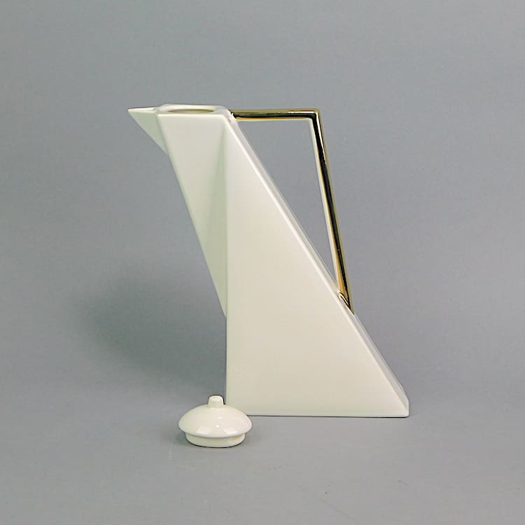 French 3 colour ceramic three piece coffee set, part of the Memphis range and signed Salins Studio. Consists of a white coffee pot, black milk jug and a grey sugar bowl.