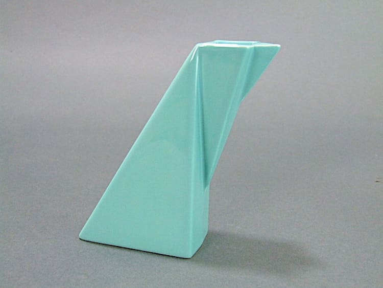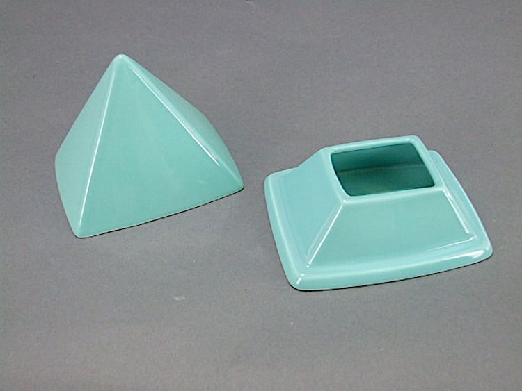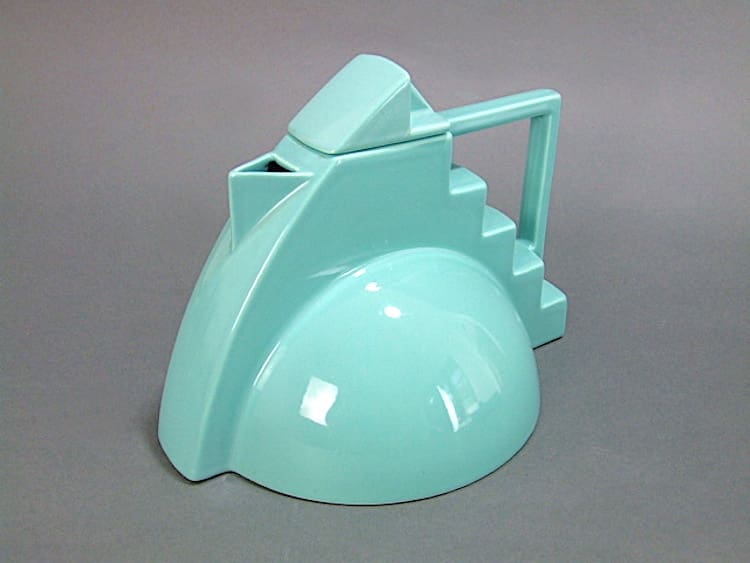 French art deco ceramic modernist teapot, marked Salins to the base. It has a turquoise glaze and there is a matching pyramid sugar bowl and milk jug.