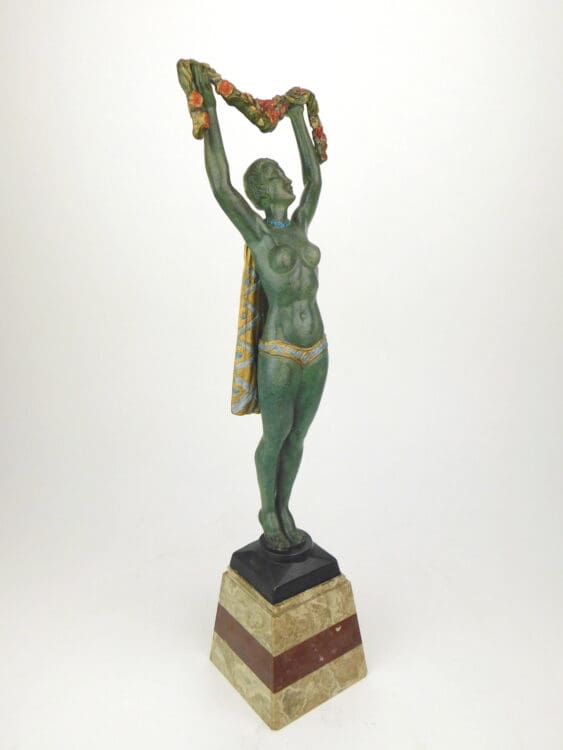 A French spelter lady, semi-nude and offering a garland of flowers, mounted on a pyramid base of mixed marbles.