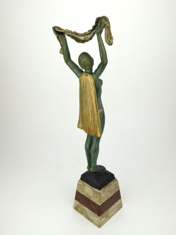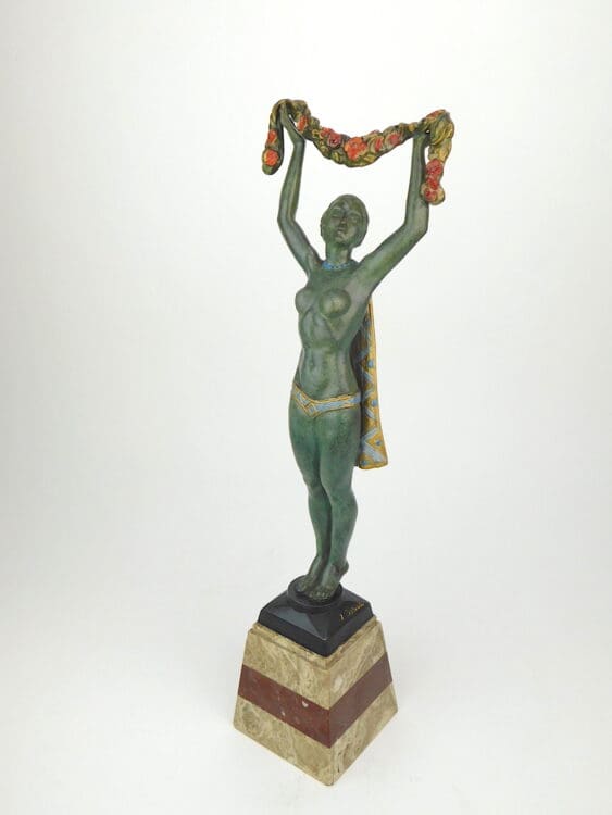 She has a green patina with signs of her original blue and gold enamelling in places and is signed to the metal base.