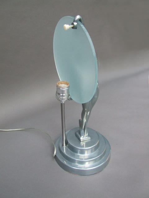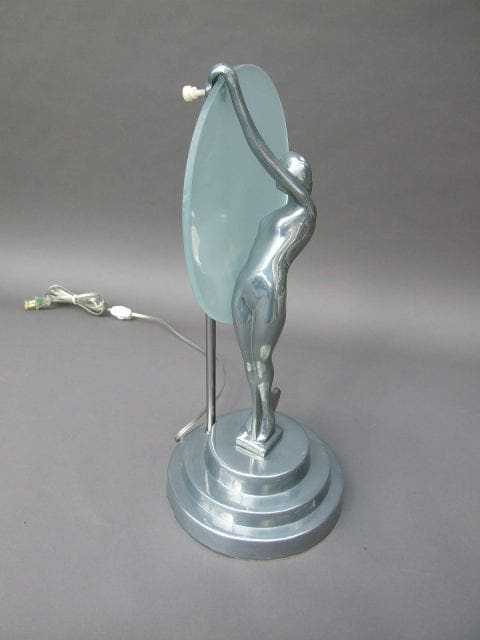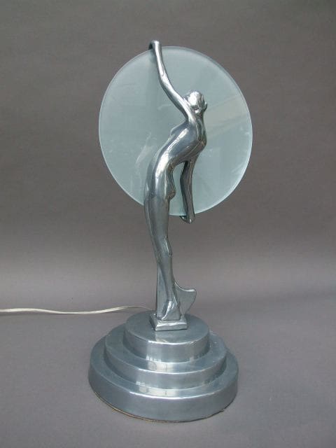 Stylised lady lamp made by Sasparilla in the 1970’s in polished alloy metal with opaque glass disc shade.