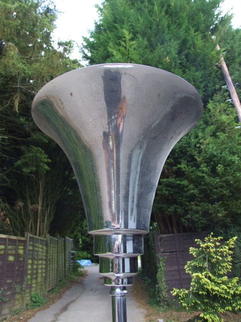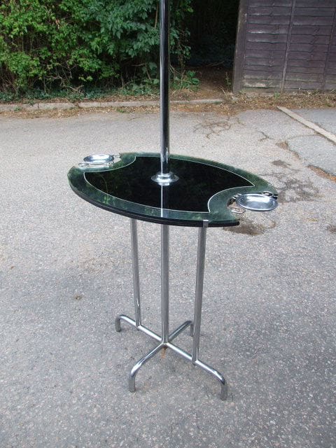Ovular chrome table with black and silver glass top and an ashtray to either end. Chrome bar to the centre supports a chrome trumpet uplighter.