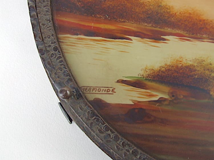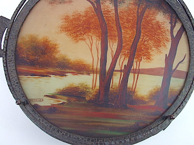 French wrought iron surround and reverse painted glass central section, signed by the artist Jermonde. Beautifully hand painted with a lake scene.