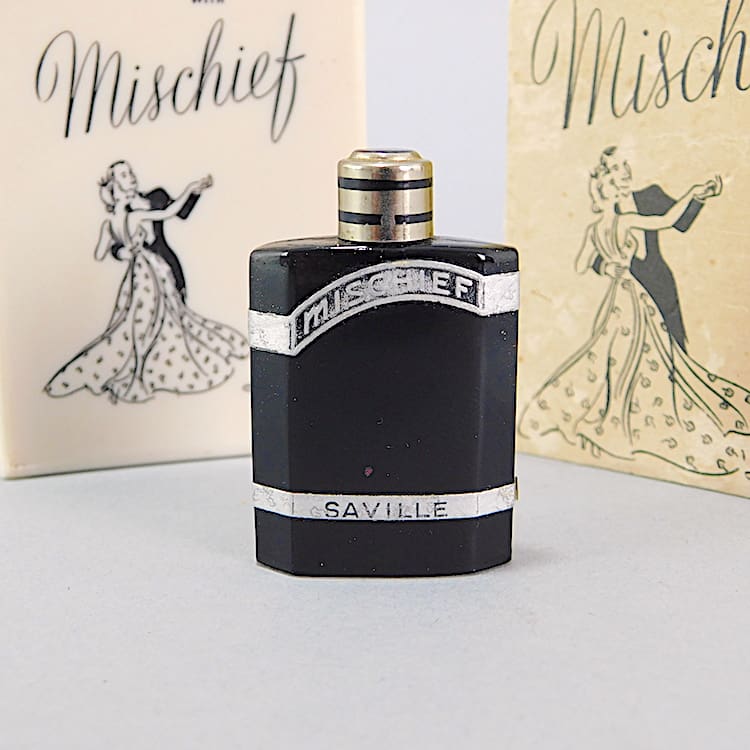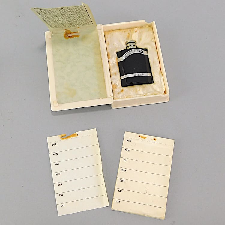 Engagements with Mischief – A small black scent bottle in an original cream celluloid case.