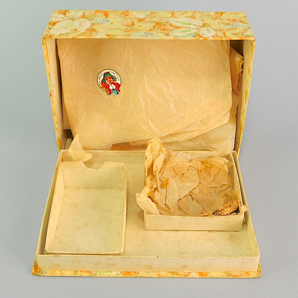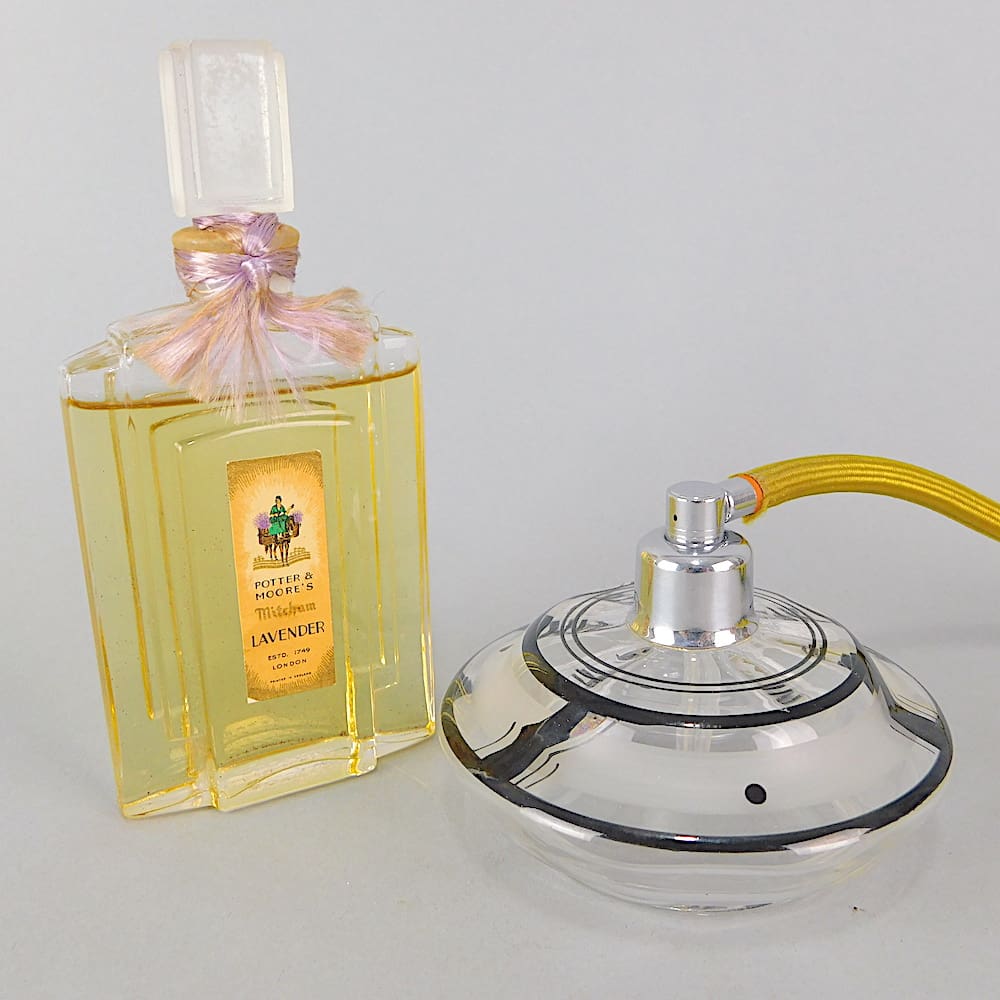 Original 1920s scent set which is in its original ornate card box and consists of a nearly full bottle of lavender perfume by Potter and Moore and a hand enamelled Czech scent bottle.