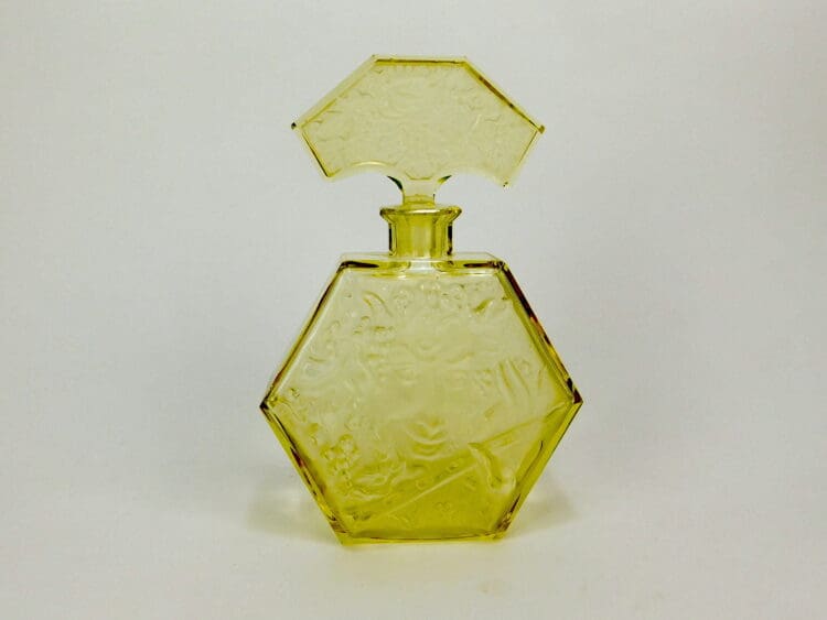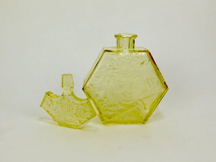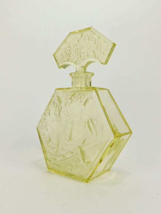 Czechoslovakian yellow tinted Art Deco decanter, depicting Bacchus with grapes to the front. Made by Hoffman/Schlevogt as part of the Ingrid line glassware.