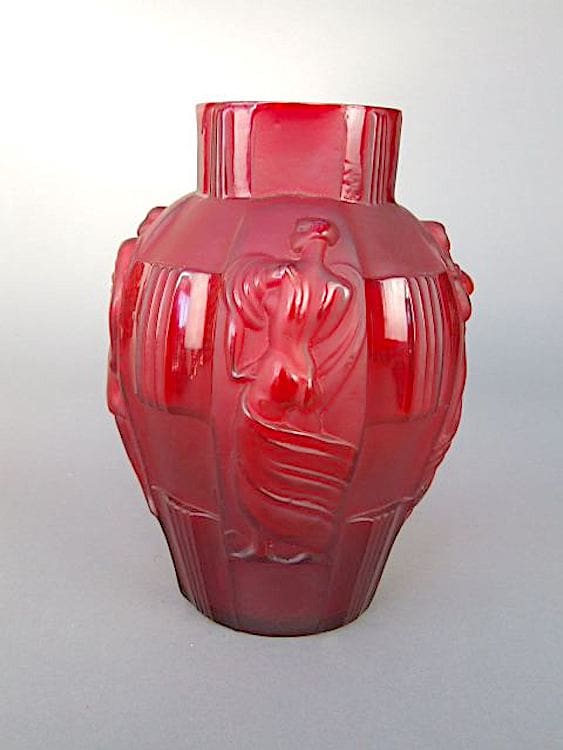 Fabulous rare red glass vase decorated with 4 ladies around the outside, model number 25531. Made in Czechoslovakia by Schlevogt and designed by Artur Pleva.