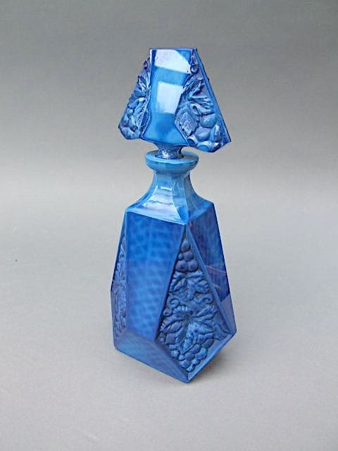 Lapis blue Intaglio grape design glass decanter set, consisting of decanter and 6 glasses. Made by Schlevogt in the early 1930’s.