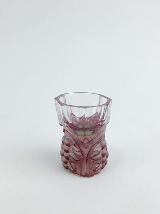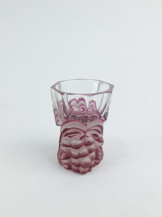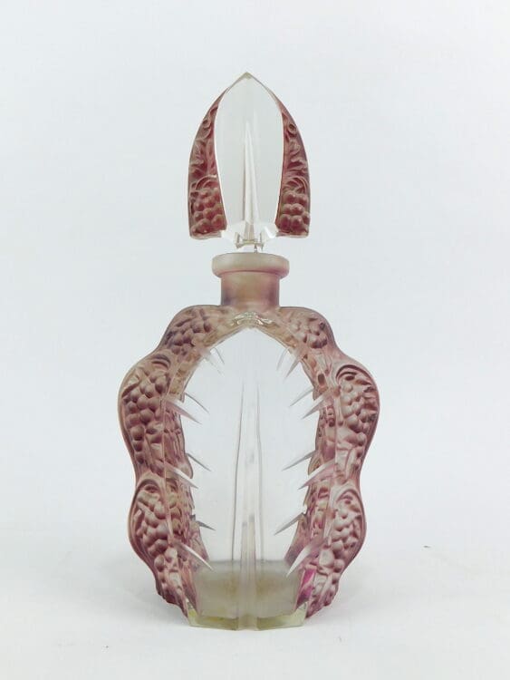 A rare and lovely grapes frosted pink glass decanter set, made in the 1920’s by the Hoffman company and designed by Schlevogt and comes with 4 matching glasses.