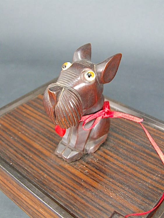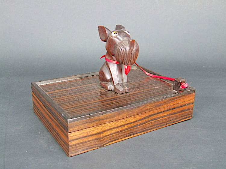 Fabulous macassar ebony French box with a Rac the terrier carved wooden dog on the lid with phenolic tongue and eyes. This dog was probably modelled as Rac the terrier from the famous Pol Rab Ric and Rac cartoon series. Unsigned but undoubtedly by Dankarner.