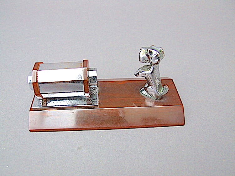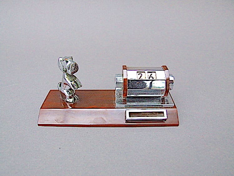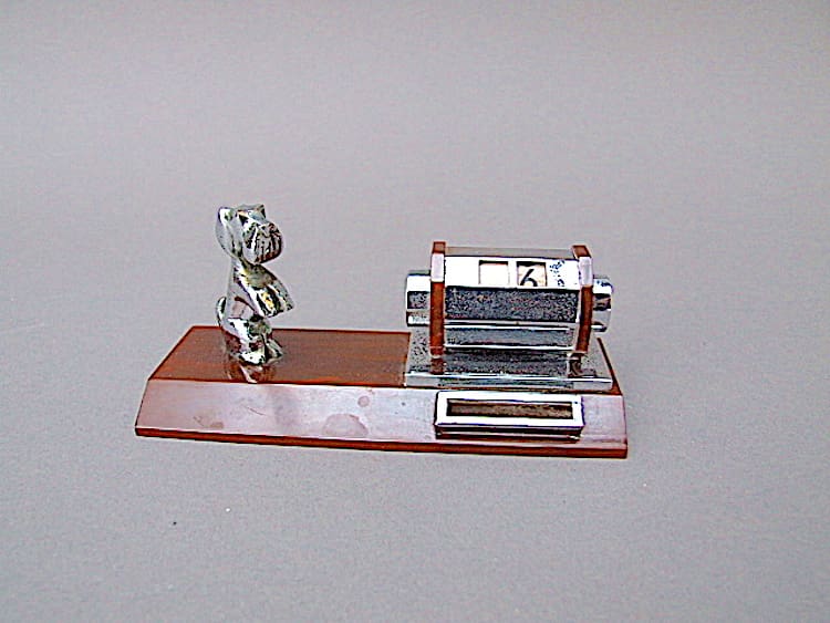 Tortoise shell phenolic base with chrome dog and desk calendar.