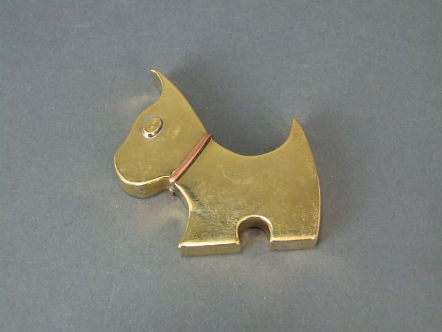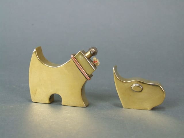 Brass and copper scotty dog lighter, possibly trench art. Pull his head off to reveal the wheel ignited lighter.