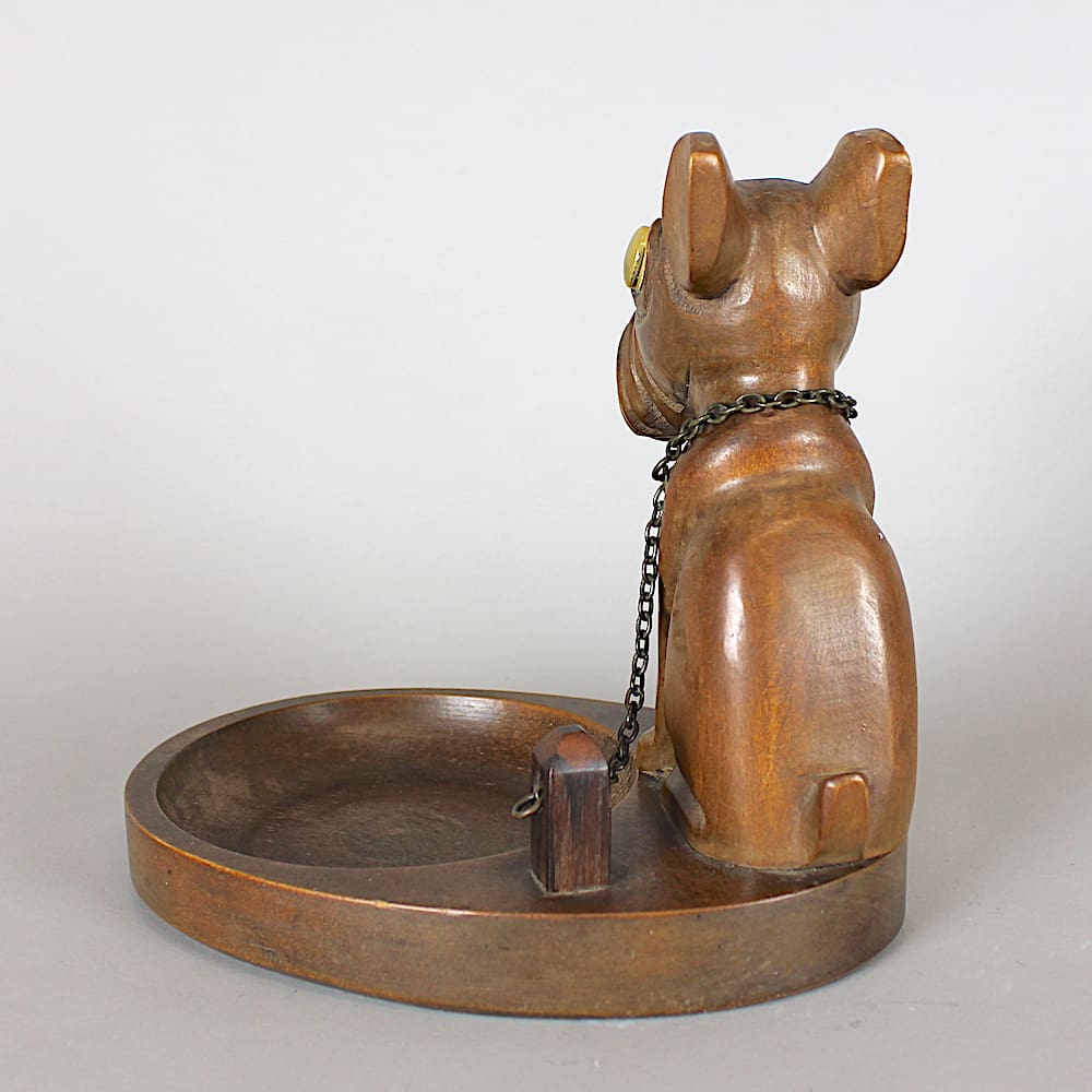 Fabulous macassar ebony French trinket dish with a Rac the terrier carved wooden dog on the side.