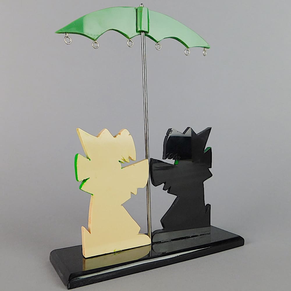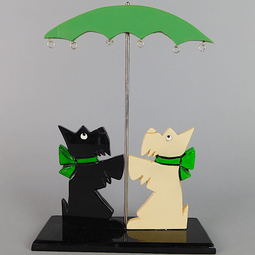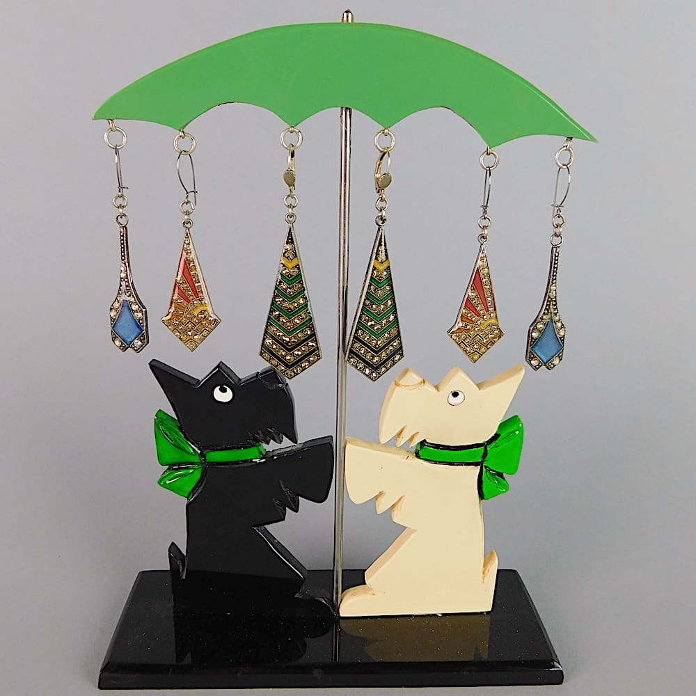 2 scotty dogs, presumably based on Ric and Rac, sit under and umbrella below earrings.